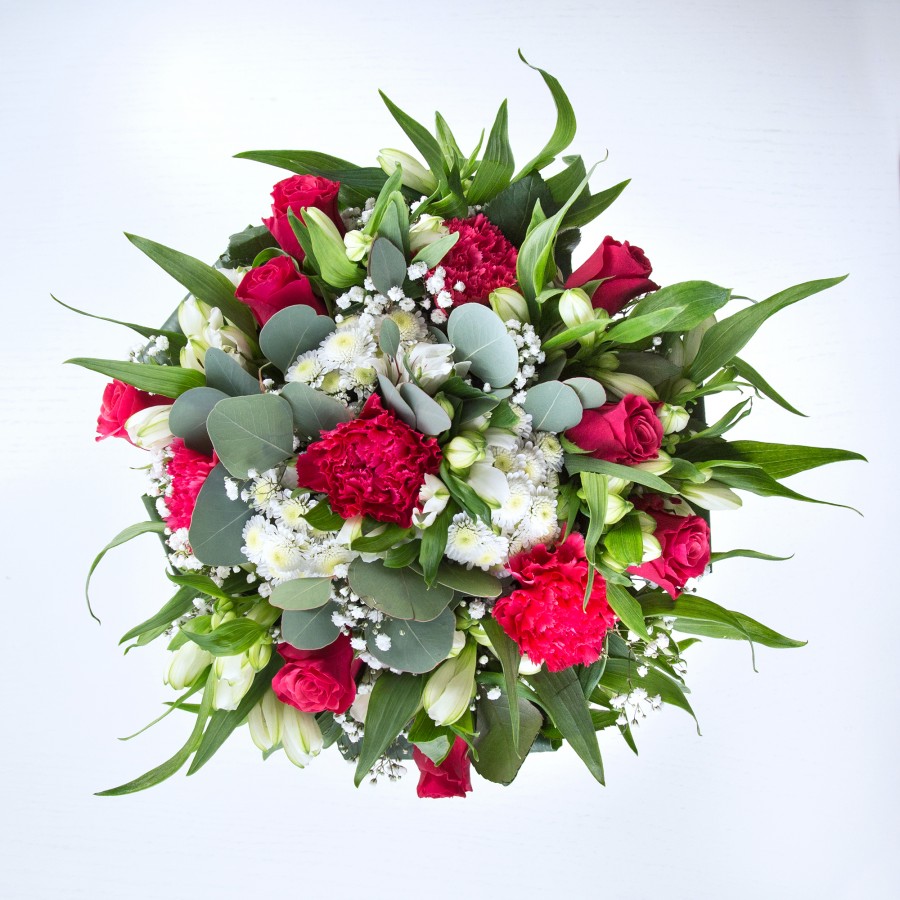Embrace the timeless beauty of our Timeless Beauty Bouquet. This exquisite arrangement features a blend of white chrysanthemums and gypsophila, enriched with the vibrant reds of roses and carnations. The addition of white alstroemeria and aspidistra leaves adds depth and elegance to the design.